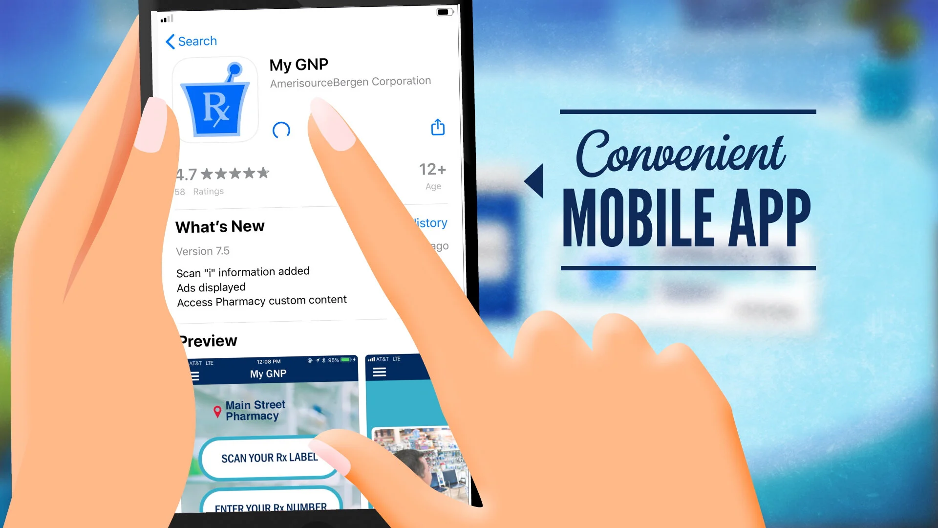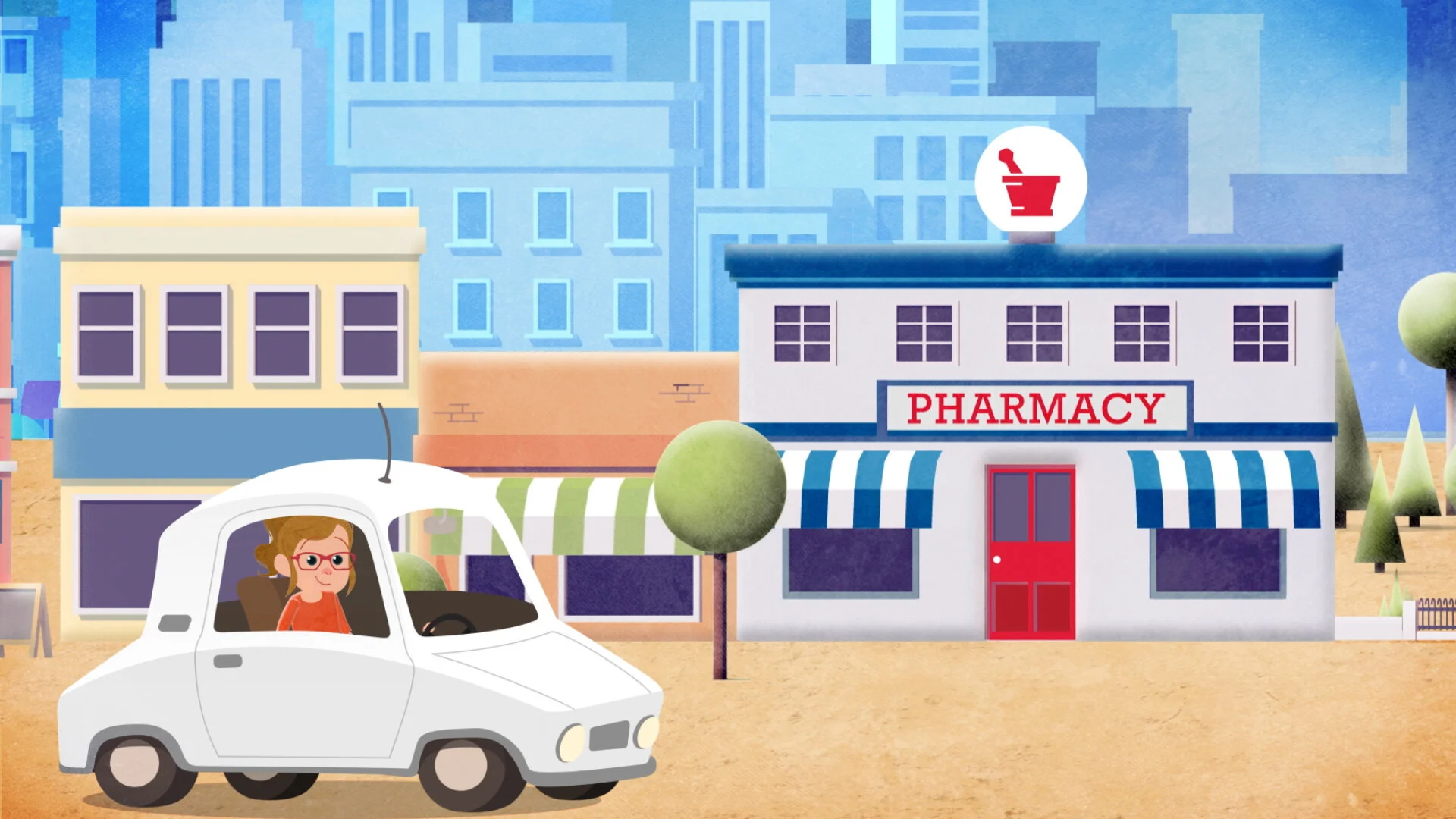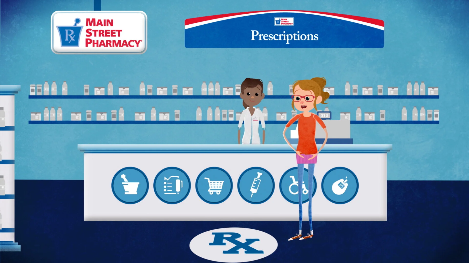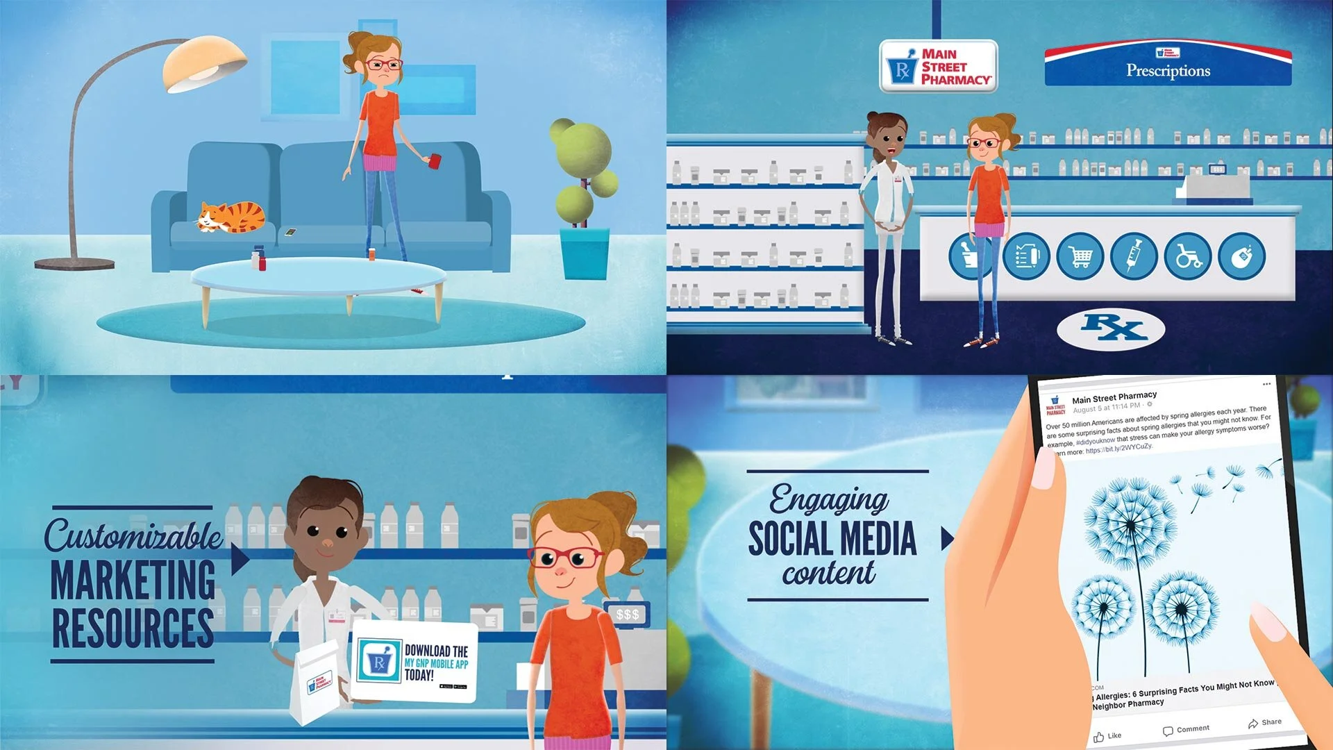 Sticking with the Good Neighbor Pharmacy brand, and borrowing from previous projects with this client, we created a fully-animated environment and created a brand new rigged character as our hero (along with cartoon cat!). The biggest change to this video was using in-phone content borrowed from the real world, which under most circumstances can be a tough thing to integrate into an animation aesthetic.